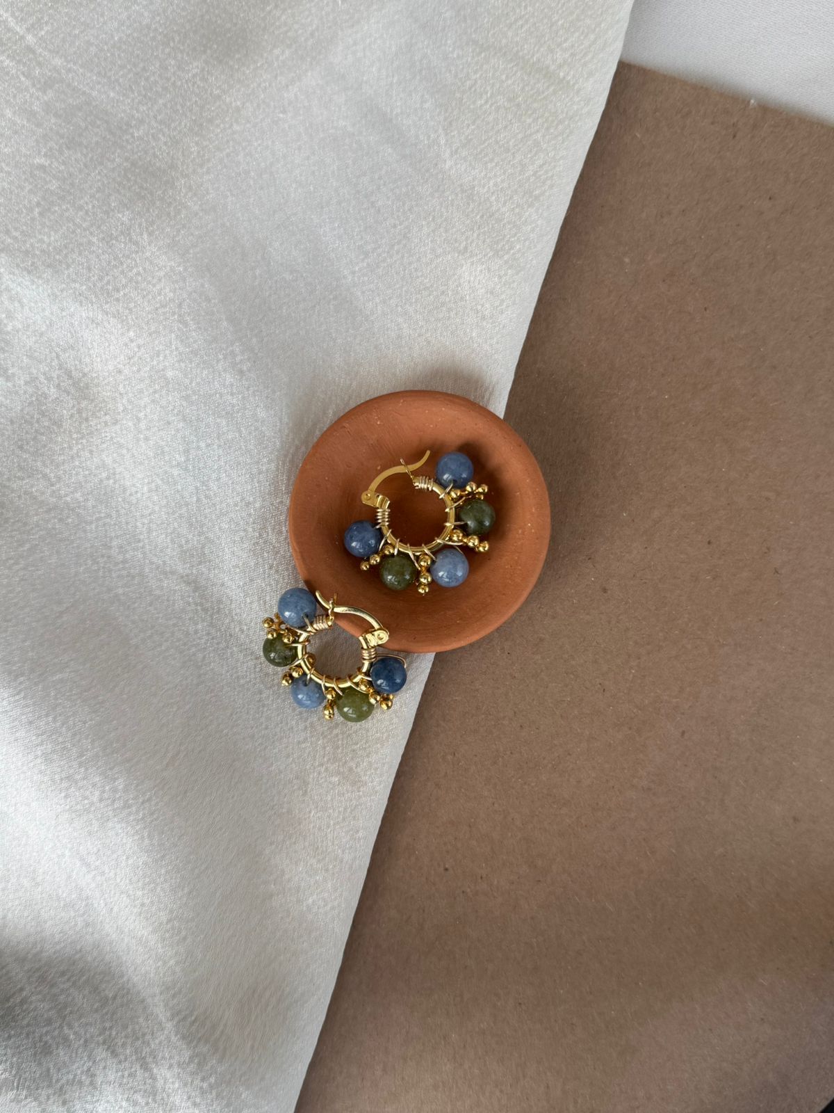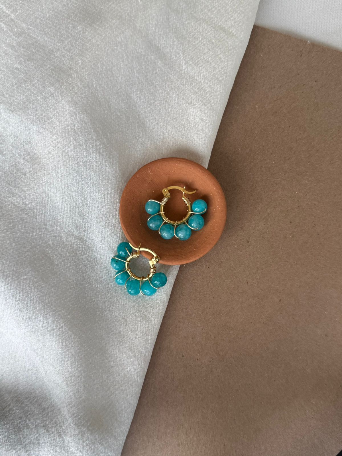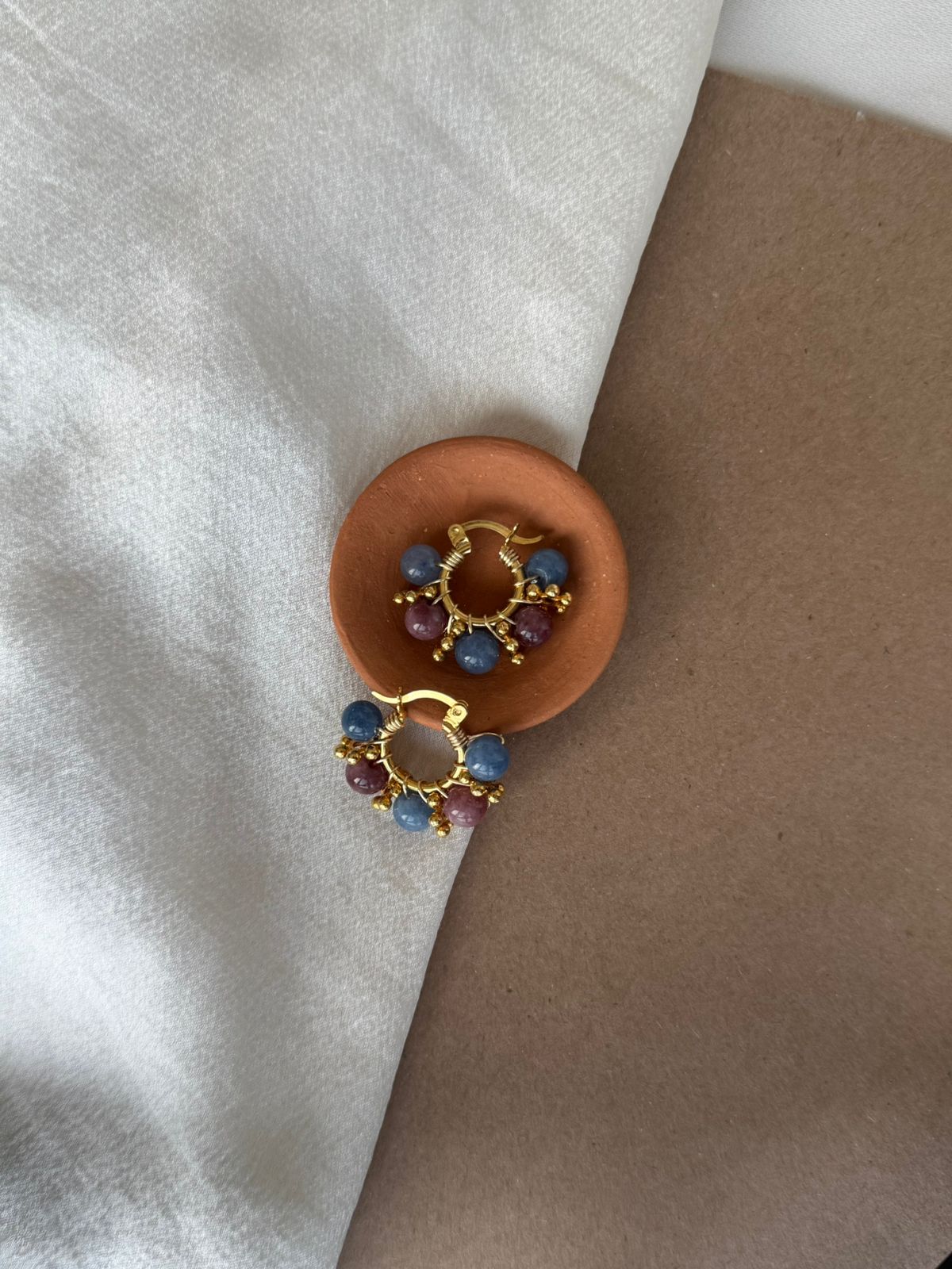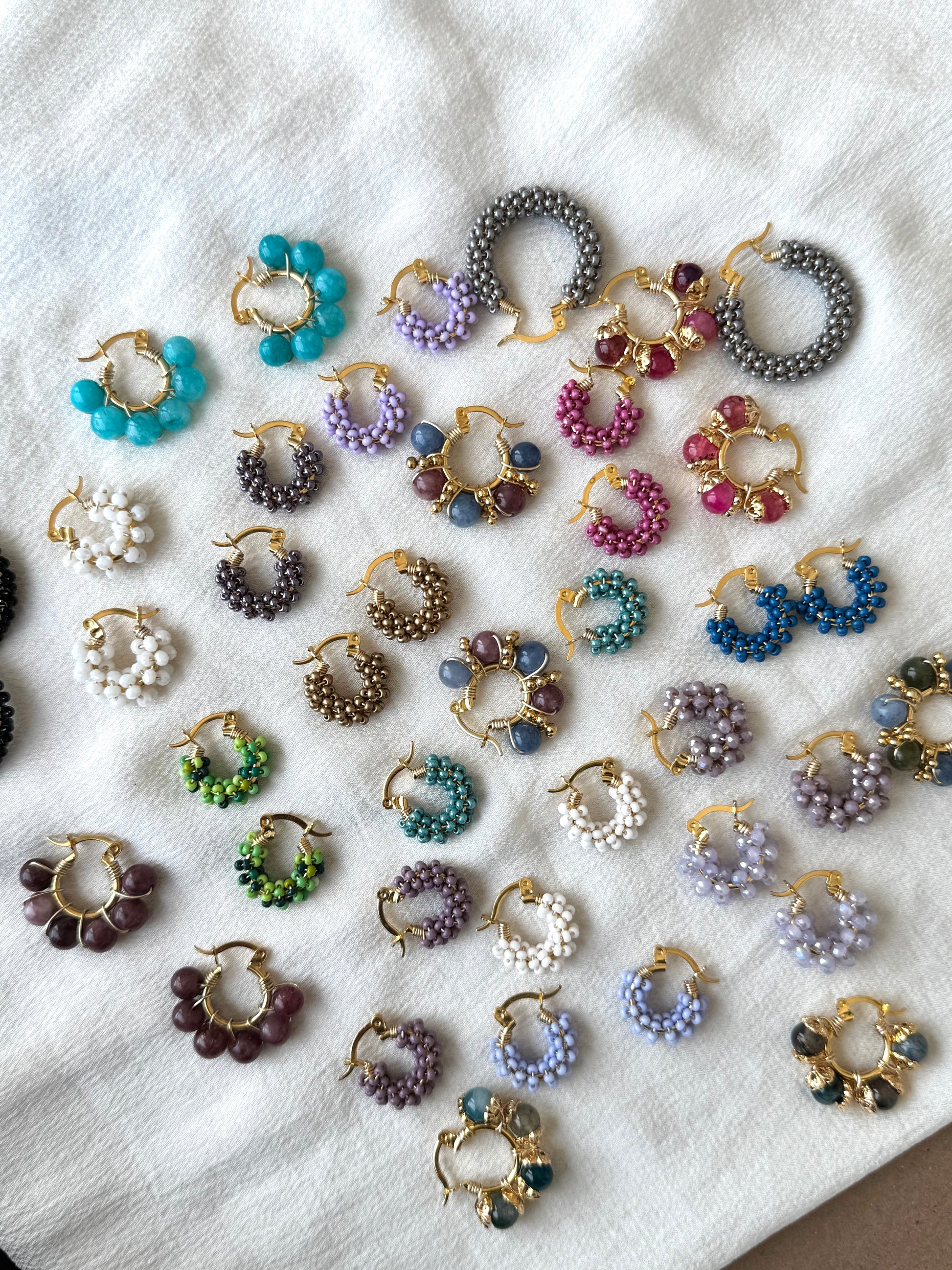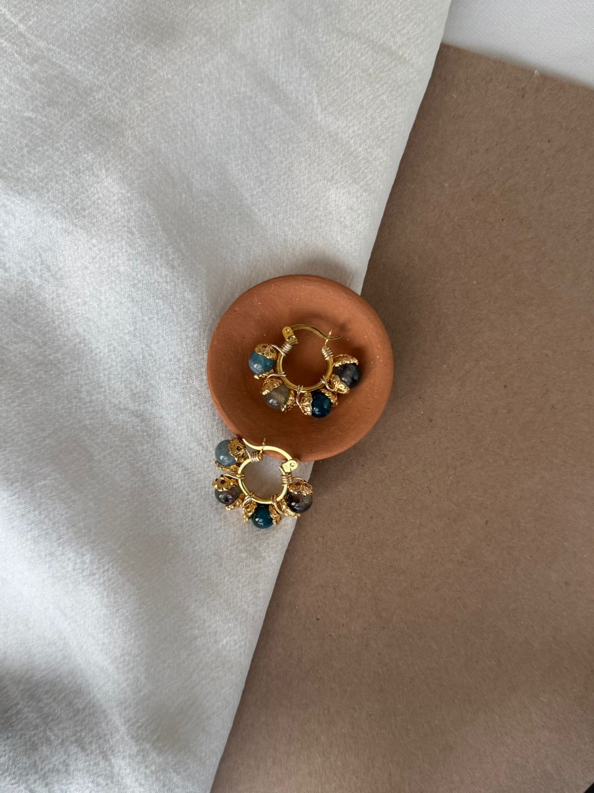 Estas arracadas doradas son una fusión perfecta entre tradición y estilo contemporáneo. Están elaboradas a mano en Guanajuato por Paty, una artesana que combina técnicas tradicionales con un diseño lleno de vida. Cada pieza está tejida cuidadosamente sobre una base con baño de oro de 18k, e incorpora cristales, chaquiras y ágatas de distintos colores, creando un juego vibrante de texturas y tonos.
